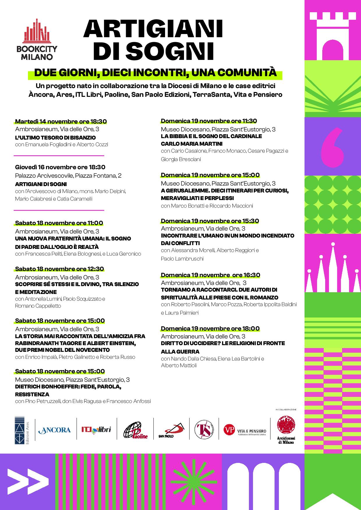L’incontro di giovedì è anche l’occasione per presentare il progetto omonimo “Artigiani di sogni – Due giorni, dieci incontri, una comunità”, un’iniziativa promossa dalla Diocesi insieme a sette case editrici cattoliche con sede a Milano che per la prima volta, in occasione di BookCity, hanno scelto di presentare una proposta culturale comune.