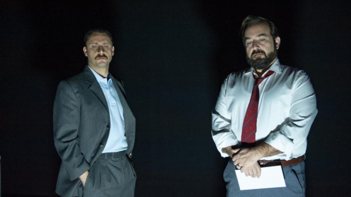 Si parte dalla fine. Dalla loro morte. In scena la macchina da scrivere, i faldoni, le sedie, le giacche… l’ufficio in cui tutto è iniziato. Due attori ed elementi scenici ridotti all’essenziale, perché padrona della scena deve essere la parola.