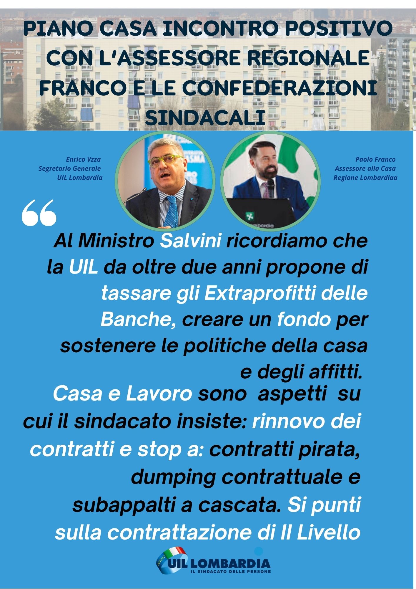 <<Abbiamo avuto modo – sottolinea il Segretario Generale UIL Lombardia Enrico Vizza – di riprendere un importante confronto analizzando punto per punto l’attuale situazione degli immobili sfitti, dei progetti Aler in corso e dei bandi per il recupero degli immobili che l’Assessorato ha predisposto e su cui le tre Confederazioni faranno pervenire il proprio contributo. Credo che per una risposta strutturale serva avere una visione di un
