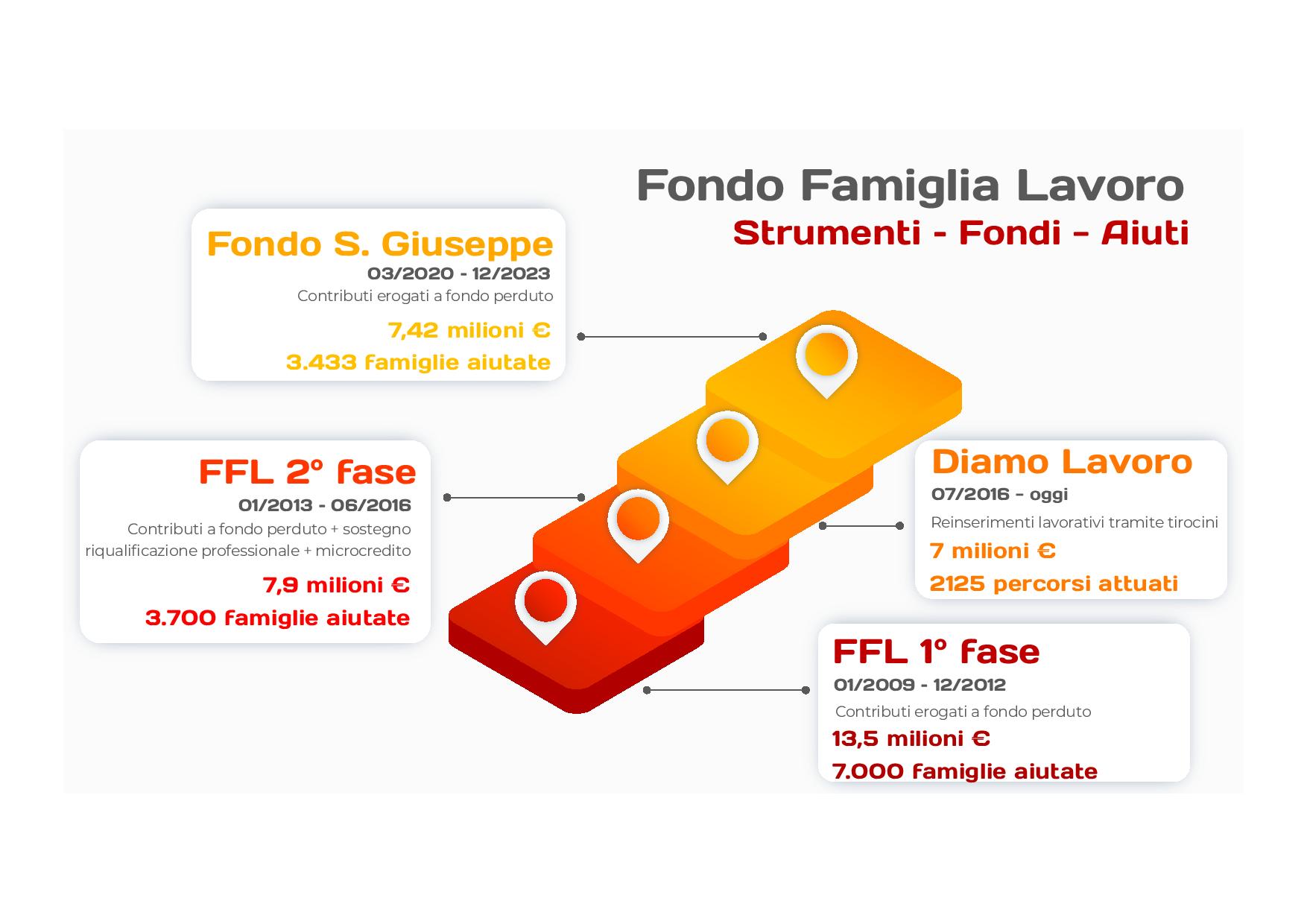 L’imponente attività del FDL (vedi infografiche in allegato) è stata resa possibile grazie alle donazioni di fedeli e cittadini, che hanno consentito di impegnare, in quasi dieci anni, risorse economiche per oltre 7 milioni di euro. Grazie alle donazioni è stato infatti possibile, e continua a essere possibile, coprire i costi di tirocini di 30 ore settimanali della durata di 3 mesi, comprensivi delle indennità di partecipazione che spettano ai tirocinanti (600 euro mensili più buoni pasto). Accanto alle risorse economiche, cruciale si è rivelato il lavoro volontario degli operatori nei territori (360 volontari nei 75 Distretti del FDL).