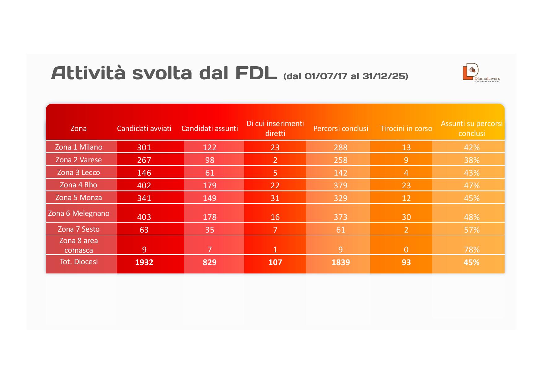 La scelta si è rivelata vincente. Dal 1° gennaio 2017 (data di avvio dei primi tirocini) al 31 dicembre 2025, nelle sette Zone pastorali della diocesi ambrosiana il FDL ha ascoltato e orientato oltre 4.500 persone in cerca di lavoro, avviandone a tirocinio 1.932. I percorsi conclusi, alla fine dell’anno scorso, erano 1.839, e in ben 829 casi (il 45,08% del totale) i tirocinanti avevano trovato lavoro (722 nelle imprese in cui avevano compiuto il percorso formativo, e addirittura 107 per via di assunzione diretta pre-tirocinio). Negli altri casi, molte persone hanno trovato occupazione in altre aziende, potendo mettere a frutto le competenze acquisite grazie ai tirocini e all’accompagnamento sociale, oltre che formativo, che il FDL assicura, e che consente di affrontare le fragilità (sociali, relazionali, educative) di cui è sovente portatore chi viene segnalato o si rivolge al Fondo.