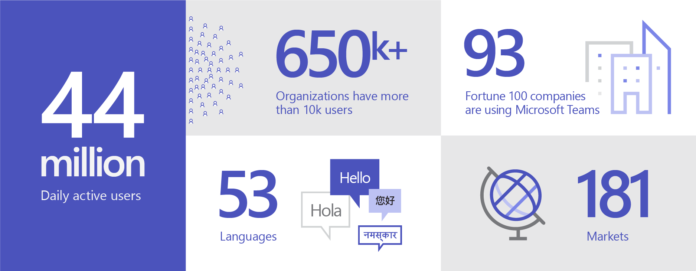 Negli ultimi tre anni, migliaia di organizzazioni, piccole e grandi – incluse 93 delle aziende Fortune 100 – hanno scoperto come Teams possa essere il proprio hub per il teamwork e aiutare le persone a restare connesse e motivate. Le organizzazioni leader di settore stanno implementando Teams a livello estensivo. Infatti, 20 clienti hanno oltre 100.000 dipendenti che usano Teams attivamente, tra cui Ernst & Young, SAP, Pfizer e Continental AG, così come Accenture, che ha 440.000 dipendenti attivi su Teams.