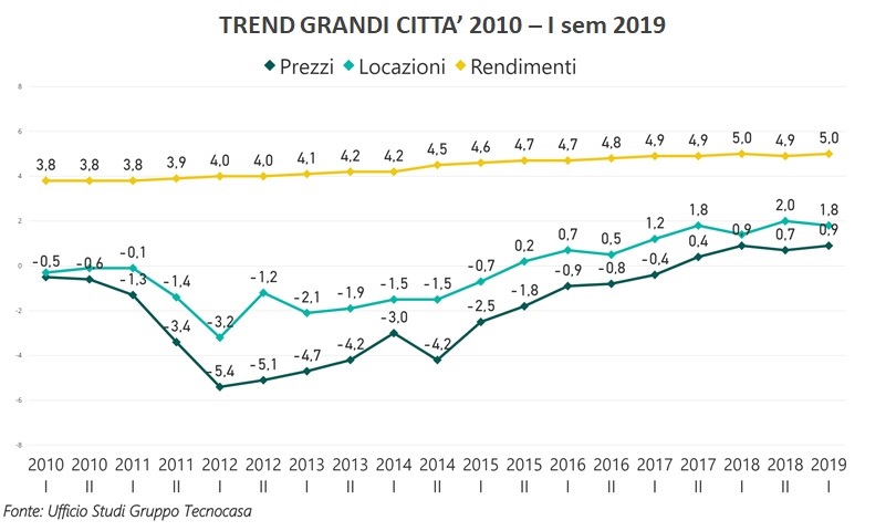 Nella prima parte del 2019 i segnali positivi dal mercato immobiliare sono numerosi: domanda in crescita, tempi di vendita in contrazione, prezzi in ripresa (in alcune realtà) e canoni di locazione sempre più elevati. Dal 2010, per la prima volta, i canoni sono in aumento su tutte le tipologie considerate: monolocali (+2,3%), bilocali e trilocali (+1,8%).