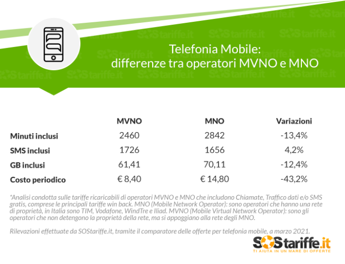 Lo studio SOStariffe.it si è concentrato sulla composizione del pacchetto-tipo di un operatore virtuale confrontandolo con quello di un provider tradizionale. L’indagine, realizzata tramite il comparatore delle offerte per telefonia mobile durante il mese di marzo 2021, fa emergere una sostanziale differenza di prezzi. In media, le offerte degli operatori virtuali sono molto più economiche di quelle degli operatori MNO.