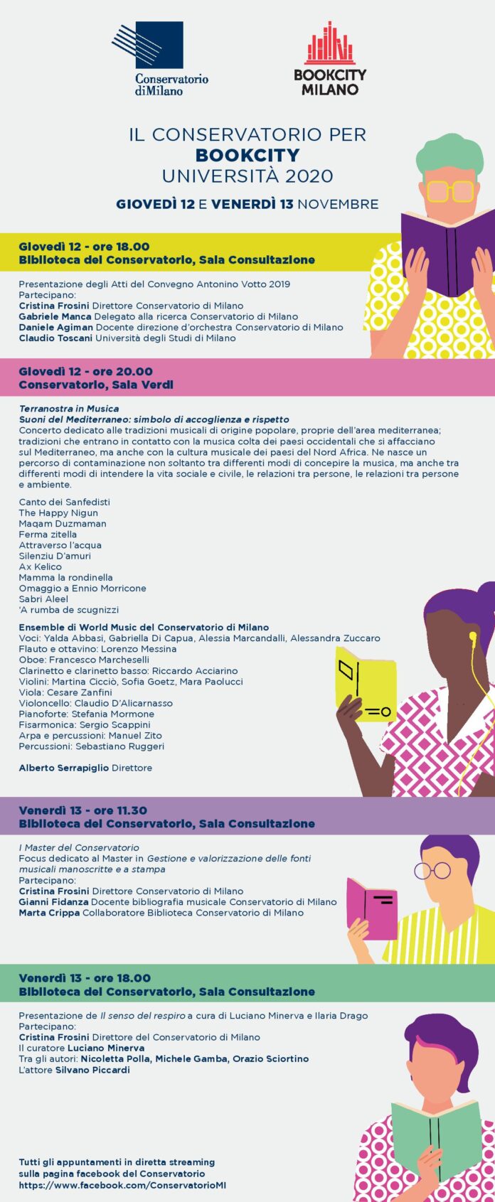 Tutti gli appuntamenti del programma Il Conservatorio per BOOKCITY Università 2020 si terranno “a distanza” sulla pagina facebook del Conservatorio, come da programma riportato di seguito e come da locandina allegata.