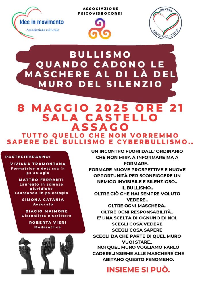 Ad Assago, in data 8 maggio 2025, alle ore 21, nella Sala Castello del Centro Civico, in Piazza Risorgimento, si terrà l’incontro dal titolo “Bullismo. Quando cadono le maschere al di là del muro del silenzio”.