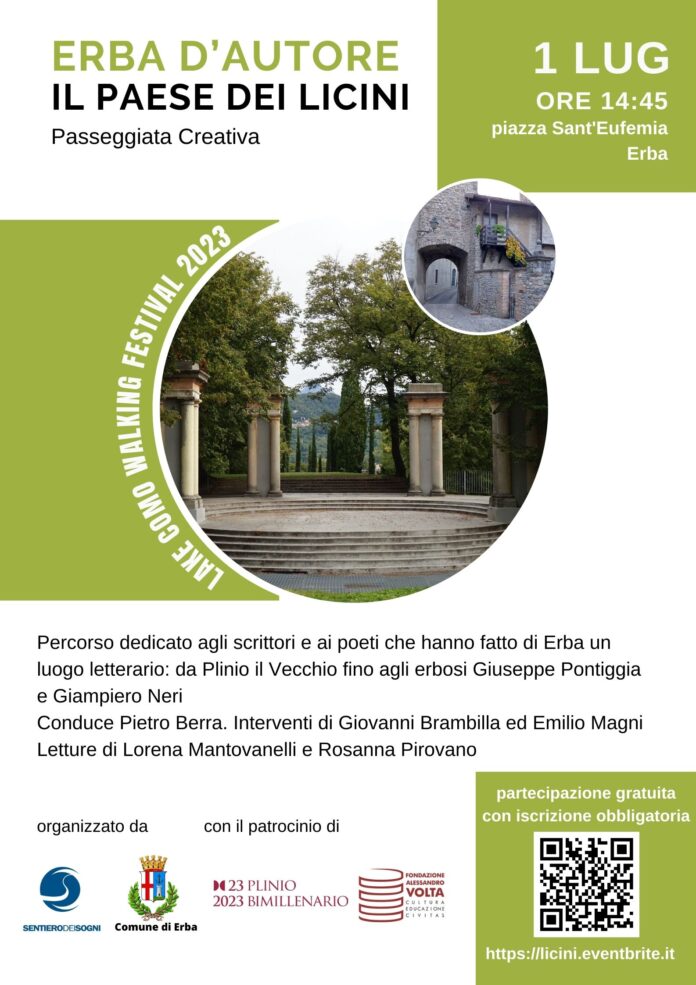 Nell’ambito della seconda edizione del Lake Como Walking Festival e delle celebrazioni nazionali del Bimillenario della nascita di Plinio il Vecchio, coordinate da Fondazione Alessandro Volta, l’associazione Sentiero dei Sogni organizza, con il sostegno del Comune di Erba, la passeggiata creativa “Il paese dei Licini – Erba d’autore”.