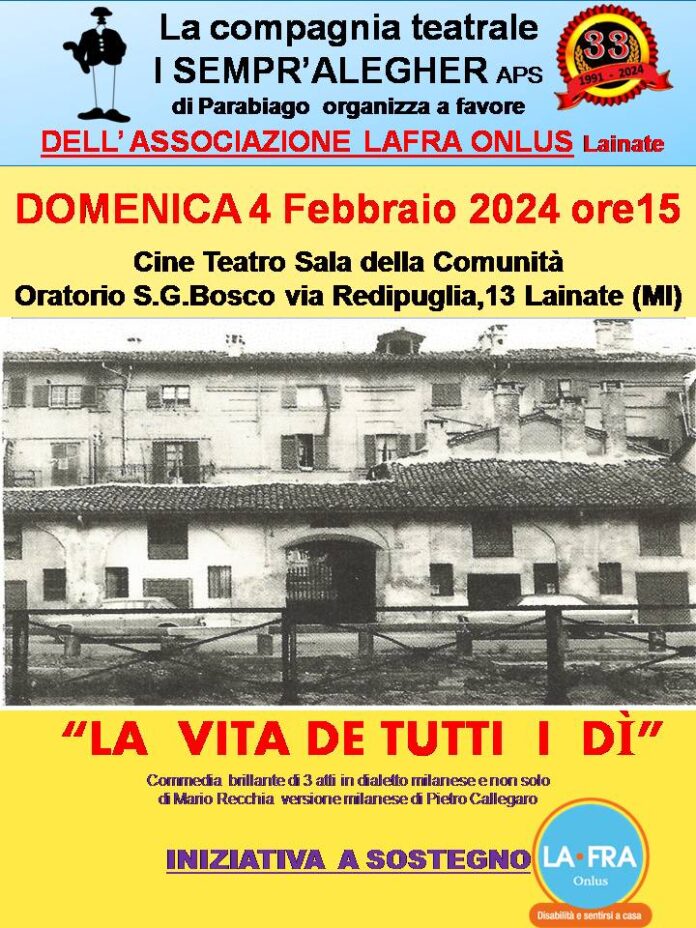 Domenica 4 febbraio, alle ore 15, la compagnia teatrale “I sempr’alegher” organizza e porta in scena una brillante commedia teatrale. LA VITA DE TUTTI I DI’ è il titolo della divertente rappresentazione in tre atti, anche in dialetto. Si tratta di una iniziativa a sostegno dell’Associazione La-Fra.