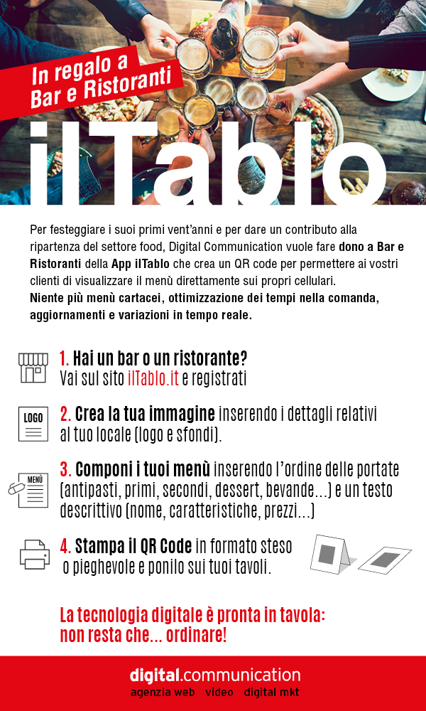 Per festeggiare i suoi primi vent’anni, Digital Communication, agenzia di comunicazione e web agency specializzata nella realizzazione di siti internet, progettazione web design e produzione video di Bergamo, ha messo a punto una originale web app, ilTablo, che ti permette di creare un elenco di locali con rispettivi menù digitali consultabili dai clienti direttamente sul proprio smartphone, grazie a un semplice QR code stampabile in due formati. Per dare un contributo alla ripartenza del settore food, Digital Communication ha deciso di donare a titolo gratuito per tutto il 2020 la fruizione di questa app a tutti i ristoranti, bar e pub, ma anche sagre ed estivi.