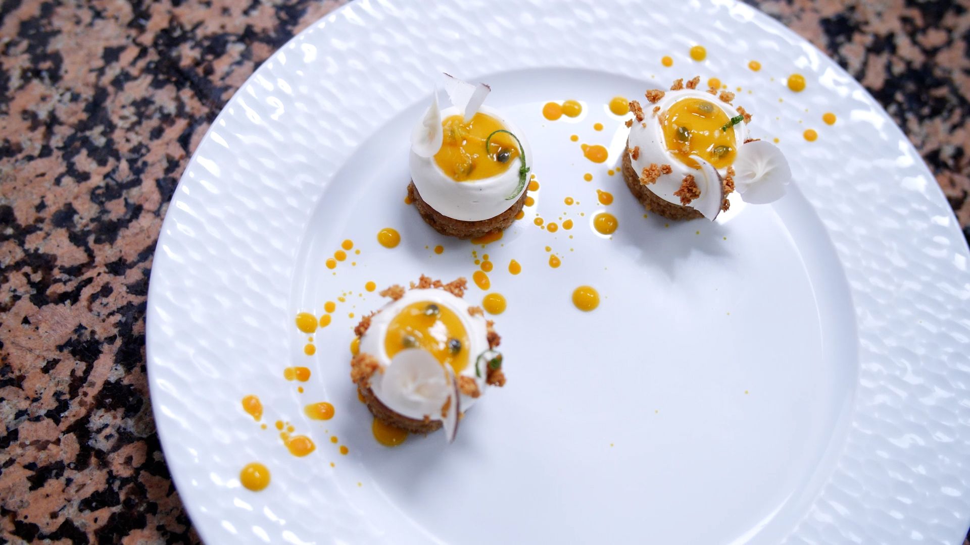 Jonathan Chauve, Chef pasticciere e cioccolatiere di Weiss, ha preparato un “dessert al piatto” composto da biscuit di grano saraceno al lime, una ganache montata di Anëo 34% (senza aggiunta di zucchero), cocco essiccato e coulis di frutta esotica.