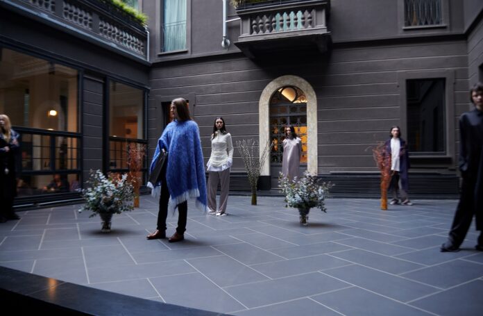 La collezione include cappotti lunghi, giacche sartoriali, completi mannish,piumini, stole e accessori. Tra gli accessori, la borsa “Achille” sembra una vera e propria scultura grazie a un’ossatura composta da quattro aste di metallo che le consente di stare in piedi da sola, mentre la borsa “Cadre” aggiunge un tocco grafico allo stile Harunobumurata. La paletta dei colori comprende toni freddi ed eleganti come il nero, ilgrigio, il bianco e le diverse sfumature del blu.Designer è Harunobu Murata