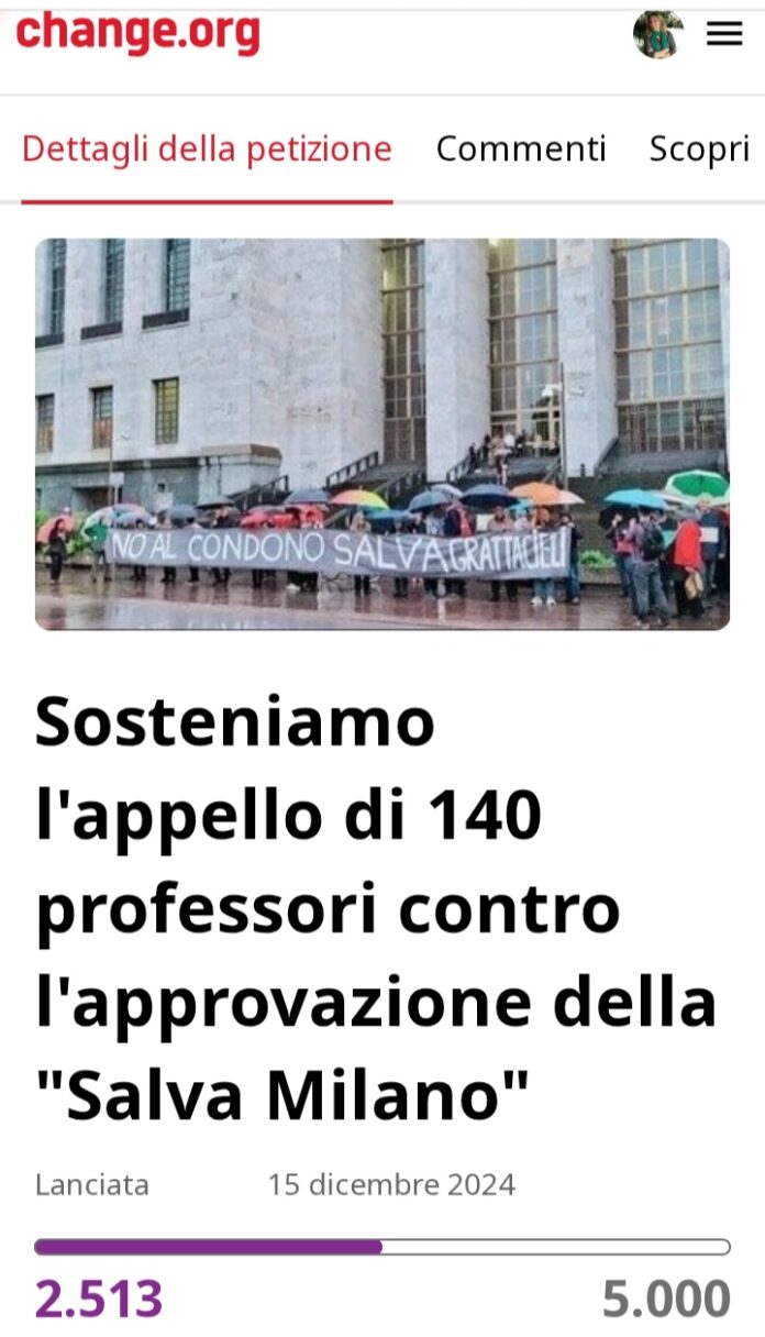 I comitati civici e ambientalisti milanesi hanno lanciato tramite la piattaforma Change.org una petizione a sostegno della lettera-appello inviata pochi giorni fa ai Senatori della Repubblica da 140 professori con la richiesta di non firmare la proposta di legge cosiddetta “Salva Milano”, già approvata alla Camera.