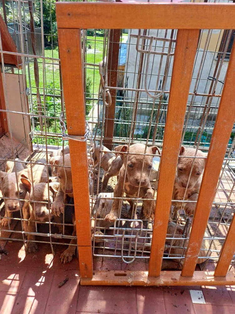 Dieci cuccioli, ancora non microchippati, dell’età apparente di circa un mese, stipati in una gabbia metallica quadrata di 1 metro di lato, collegata a una cuccia in legno, inadeguata ad ospitarli tutti.