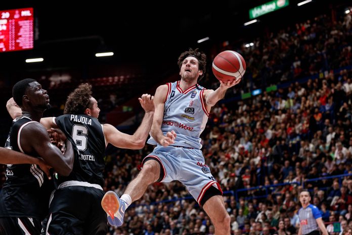 Una tripla rocambolesca di Pajola genera il 5-0 che spinge Bologna avanti di otto punti. Ad impedire alla Virtus di fuggire è Shields con una tripla, ma è solo un attimo. Una palla rubata ancora da Pajola e un facile canestro di Morgan determinano il massimo vantaggio bianconero sul 54-45. L’Olimpia trova la reazione di Brown e Bolmaro, ma poi Lorenzo commette il terzo fallo, Una prodezza di Mannion in entrata riavvicina l’Olimpia a meno tre ma con troppi falli commessi, Bologna va in lunetta e lì costruisce il suo margine di vantaggio. Una tripla dello specialista Alston restituisce alla squadra di Ivanovic sette punti di vantaggio. Bolmaro allo scadere del terzo con un difficile jumper dalla media ricuce a meno cinque, 64-59. Nel quarto periodo, l’Olimpia scatta forte: un alley-oop Mannion-Booker e poi la seconda tripla di un chirurgico Ricci vale la parità a quota 64, raggiunta con un quintetto in cui Bolmaro è l’unico starter. Dopo un botta e risposta tra Alston e Booker, Quinn Ellis dalla lunetta firma l’agognato sorpasso a 5:13 dalla fine. Ma Bologna reagisce subito con Edwards e Niang. Sempre Edwards con una tripla apre cinque punti di vantaggio. Sale allora in cattedra Shavon Shields. Con due missili consecutivi firma un personale 6-0 che riporta l’Olimpia avanti in dirittura d’arrivo. Momo Diouf fa 1/2 dalla lunetta, Booker sfruttando un mismatch consegna il vantaggio all’Olimpia. Ma non dura. Edwards segna due volte, dalla media e con un’entrata spettacolare. A 59 secondi dalla fine, il 2/2 di Niang significa quattro punti di divario a favore di Bologna. Ma LeDay con un 2/2 accorcia, poi diventa protagonista: subisce fallo da Niang. Poi sempre lui da sotto impatta a quota 80. Manca un possesso per parte, ma Edwards spacca l’equilibrio con una tripla. L’Olimpia è alle corde. Dal time-out, esce mettendo nelle mani di Shields la potenziale tripla della parità, ma non entra. Sul rimbalzo, in qualche modo Bolmaro e Booker fanno schizzare la palla nelle mani di Ellis. Il britannico lascia partire il missile dell’83-83.
