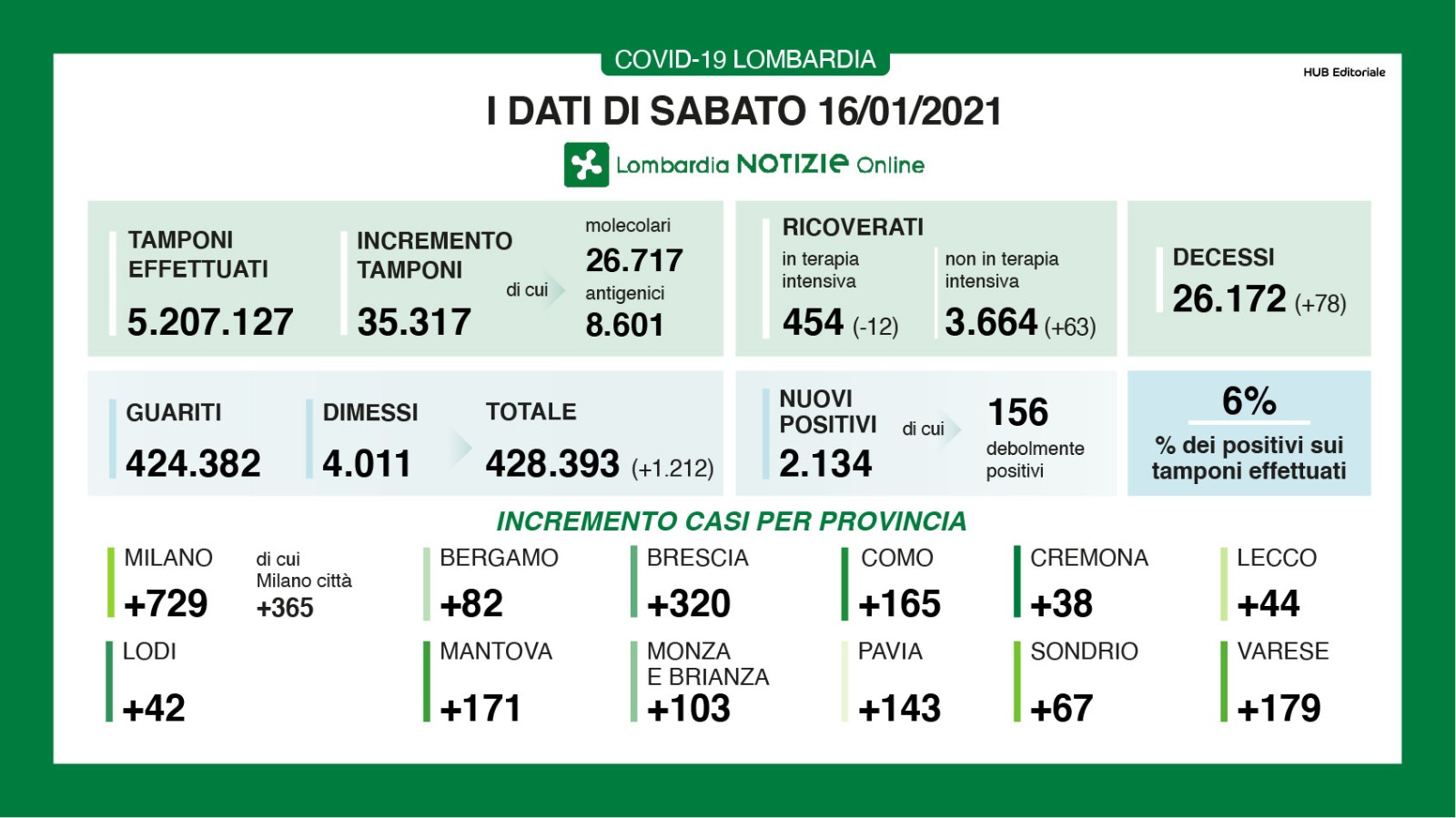 A fronte di 35.317 tamponi effettuati, sono 2.134 i nuovi positivi (6%). I guariti/dimessi sono 1.212.