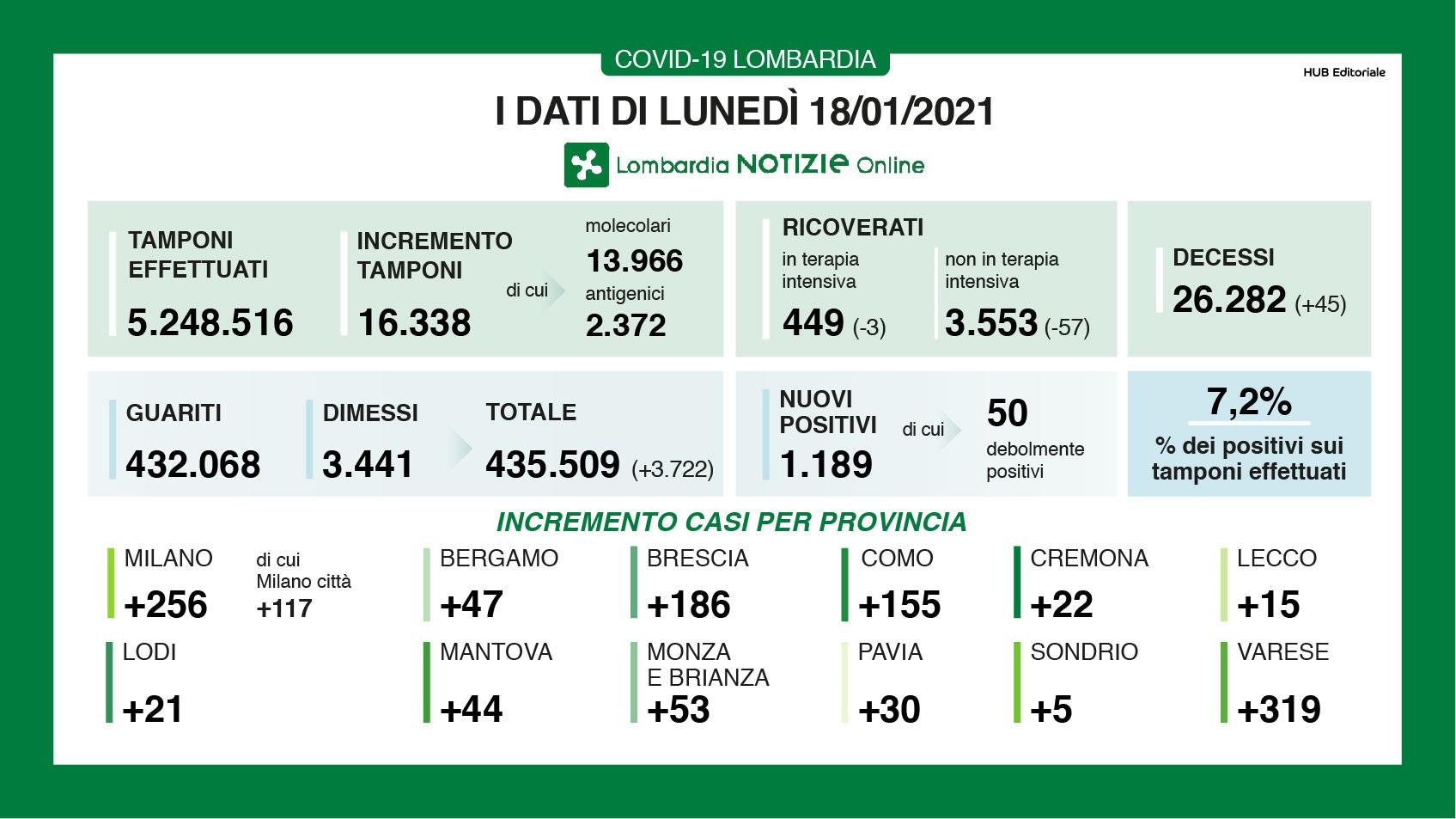 Continuano a diminuire i ricoverati nelle terapie intensive (-3) e nei reparti (-57). A fronte di 16.338 tamponi effettuati, sono 1.189 i nuovi positivi (7,2%). I guariti/dimessi sono 3.722.