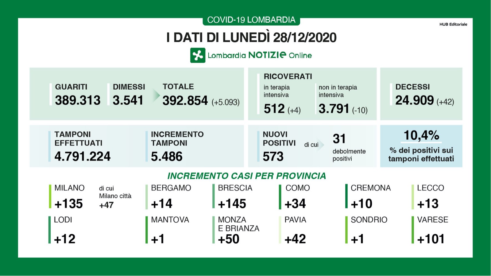 A fronte di 5.486 tamponi effettuati sono 573 i nuovi positivi (10,4%). I guariti/dimessi sono 5.093.