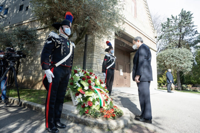 “Questo luogo è un simbolo del dolore di un’intera nazione. È anche il luogo di un impegno solenne che oggi prendiamo. Siamo qui per promettere ai nostri anziani che non accadrà più che le persone fragili non vengano adeguatamente assistite e protette. Solo così rispetteremo la dignità di coloro che ci hanno lasciato” sottolinea Draghi alla cerimonia per la Giornata Nazionale in ricordo delle vittime del Covid, al Bosco della memoria a Bergamo. (ANSA).